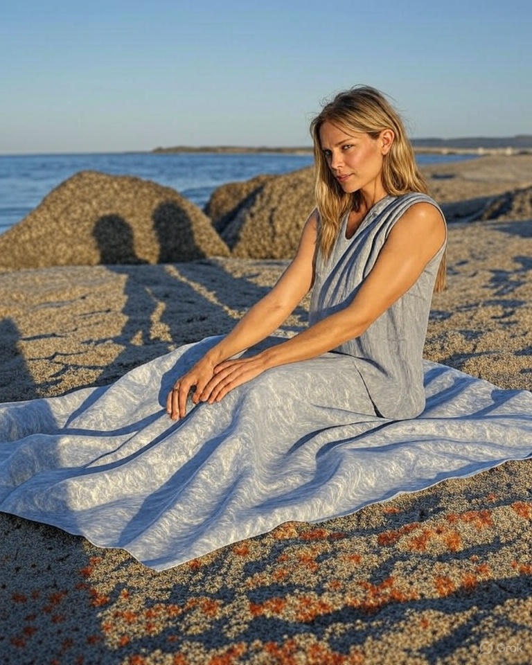 Her tousled blonde hair flows freely in the breeze, and her poised expression reflects quiet confidence. The sunlight casts a warm glow on her skin, enhancing the natural beauty she effortlessly radiates.