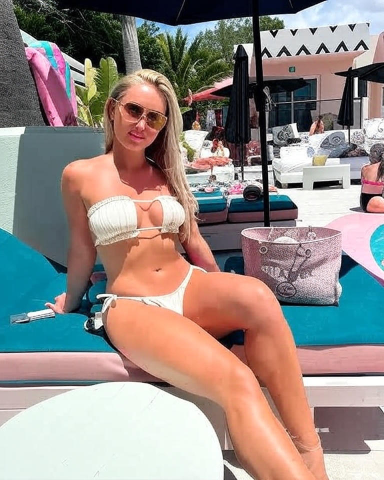 Charley Hull enjoys a sunny beach day, standing confidently on a colorful mat near the shoreline. The calm ocean waves and clear blue sky create a serene, tropical atmosphere, perfect for a relaxing summer outing.