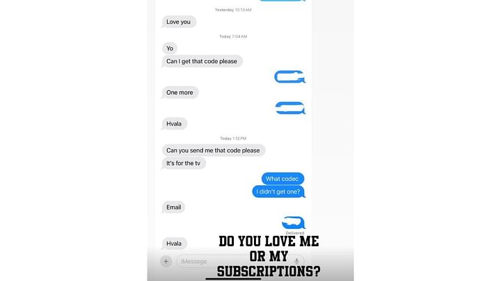 In the Instagram story, Sebastian initially sends a “love you” message. Hours later, he follows it up with multiple code requests for TV access. Nelly eventually captions the exchange with, “Do you love me or my subscriptions?”