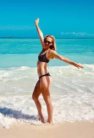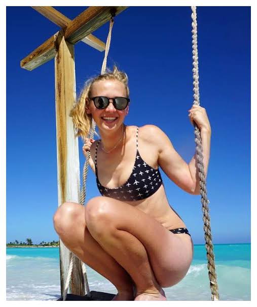 Jessica Korda enjoys a sun-filled day at the beach, radiating confidence and ease. Dressed in a stylish blue bikini, the professional golfer takes a break from the green to embrace the serenity of the ocean.