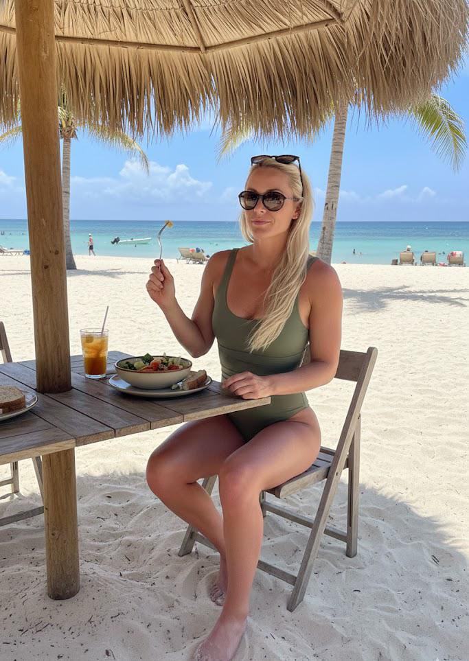 As she enjoyed her meal, which appeared to include a refreshing iced drink and a wholesome mix of vegetables, Vonn seemed to savor the peace and simplicity of the moment. The beach setting, with its powdery sand and serene horizon, offered the ideal backdrop for a well-deserved escape. It’s clear that even off the slopes, Vonn maintains a lifestyle rooted in wellness and balance; nourishing both body and mind.