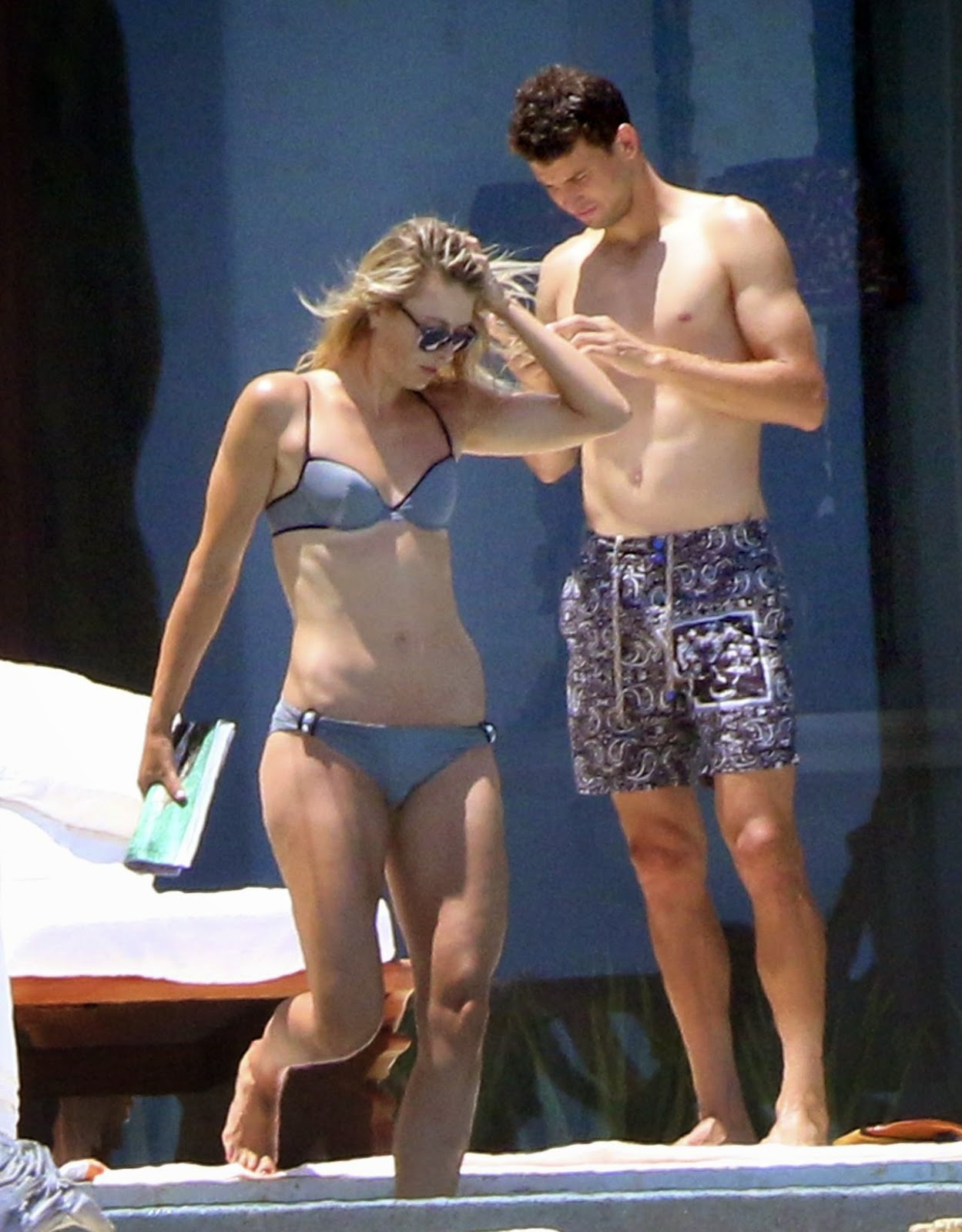 Sharapova stunned in a chic grey bikini that showcased her lean, athletic frame. Dimitrov, also unwinding, displayed his fit physique in vibrant printed swim trunks as they soaked up the sun together.
