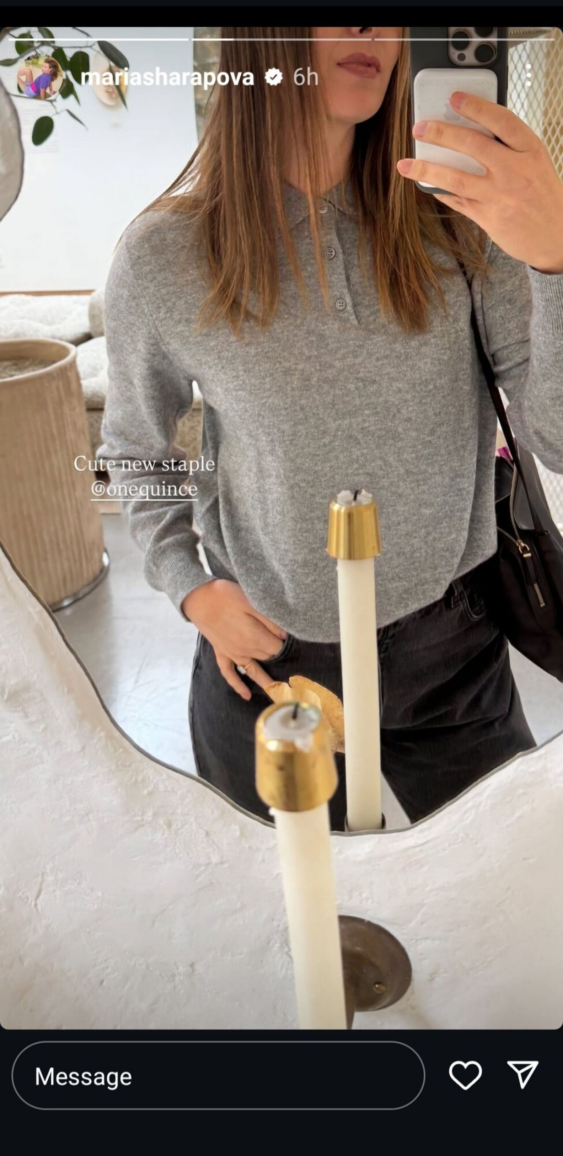 Sharapova, who got engaged to British entrepreneur Alexander Gilkes in 2020 and welcomed their son Theodore in July 2022, looked effortlessly stylish in her latest post. The 37-year-old wore a simple grey top paired with sleek black pants and a matching handbag. She playfully captioned her Instagram Story, “Cute new staple @onequince.”