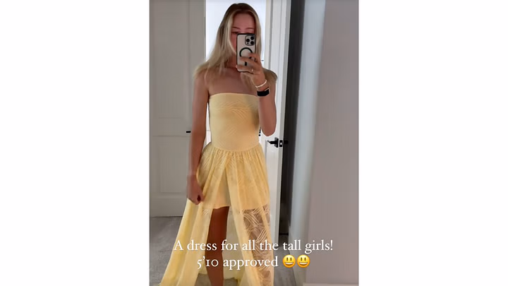 The dress, priced at \$295, was showcased with a remixed version of Sunset Party’s “Birds of a Feather” playing in the background. Korda linked the dress on her story, offering fellow tall fans a stylish wardrobe option.