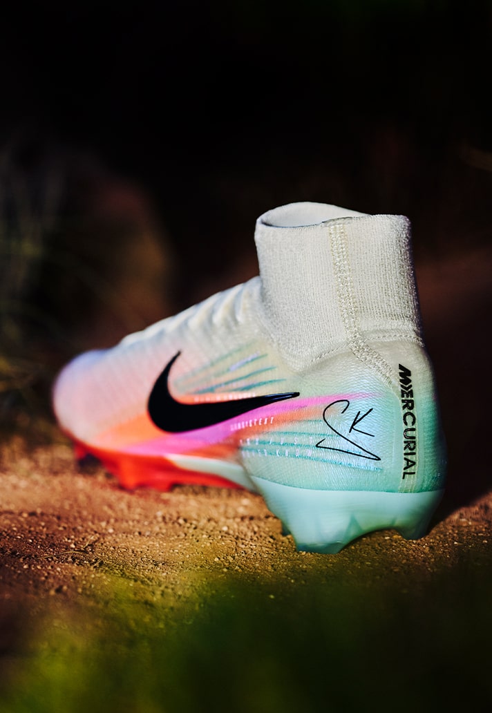Sam’s custom Mercurial reflects her 11 years in the game. The sand-toned base pays homage to the beaches of her hometown, Perth, while streaks of teal, pink, and orange represent Western Australia’s ocean, sunsets, and rugged landscapes. Etched across the upper are personal mantras—“Consistent,” “Forever Forward,” and “Perth Swagger”—tattoo-like reminders of her mindset and roots.