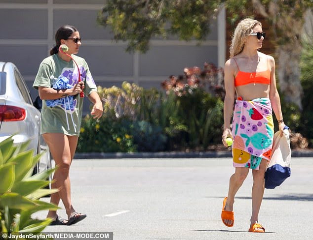Meanwhile, Kristie, 32, caught attention in a red bikini top, complemented by a beach towel wrapped around her waist, and $260 Versace slides.