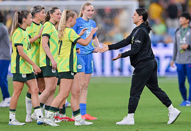 SYDNEY, AUSTRALIA – APRIL 4: Sam Kerr of Australia interacts with her teammates after they win the Women’s International friendly match between Australia and Korea Republic at Allianz Stadium on April 4, 2025 in Sydney, Australia. (Photo by Ayush Kumar/Eurasia Sport Images/Getty Images)