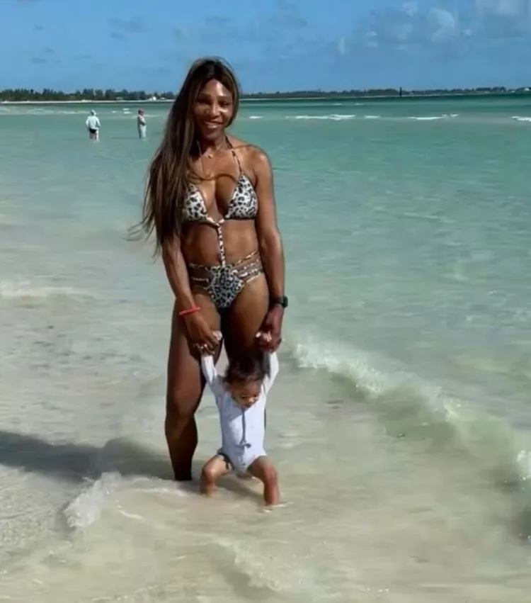 In the rare photos, Serena stunned in a metallic cheetah-print cutout bikini while holding her 18-month-old daughter’s hands in the clear water. Her stylish swimwear was paired with a gold anklet, necklace, and a sleek black watch for a chic beach look.