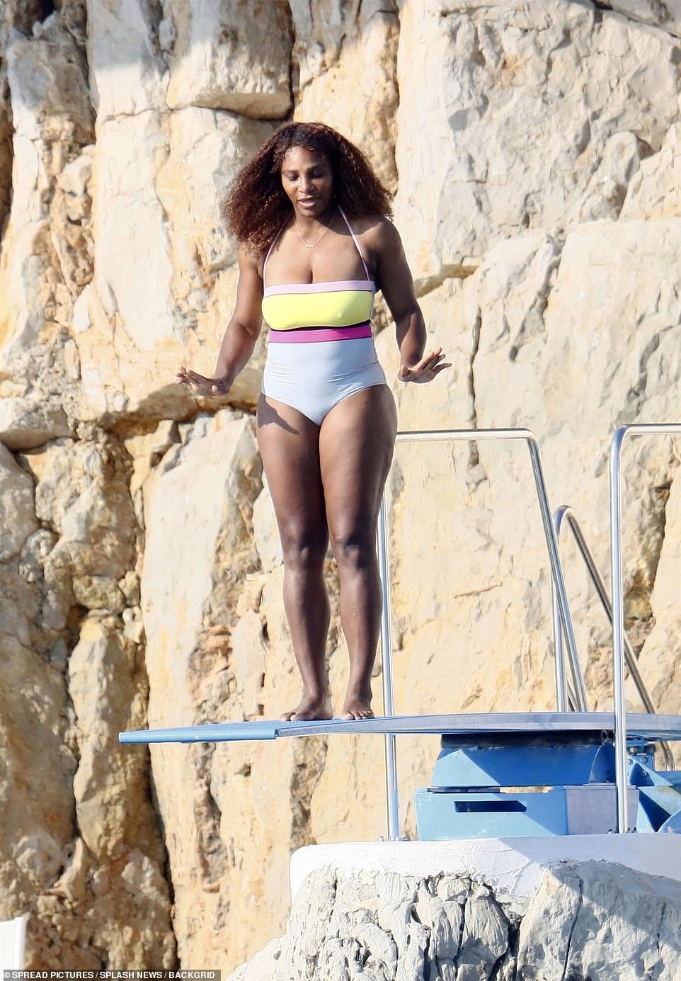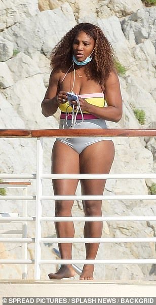 The tennis legend, in a striking one-piece swimsuit, was seen laughing and relaxing by the water.