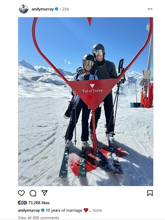 Ten years and it’s all downhill for Andy Murray and wife Kim as they celebrate anniversary on the slopes